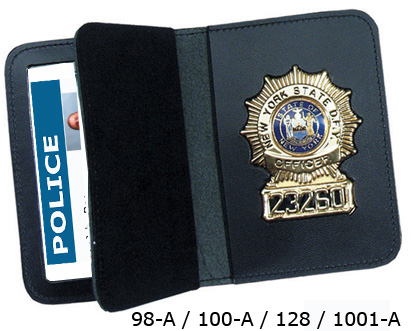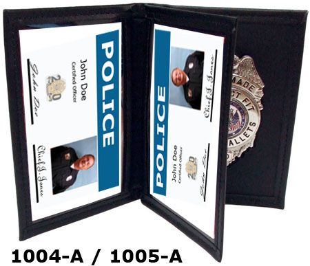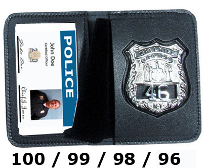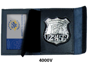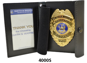 | These dress leather double ID Cases are custom cut to fit your Smith & Warren badge. The cases are made from Top Grain Leather with turned and stitched corners for a high quality finish. The case opens up like a book, first exposing your two credentials and then showing your badge. |