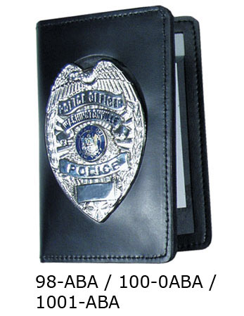 Duty leather book style double ID case with non-recessed badge flip-out mount