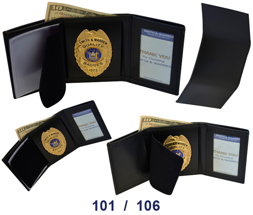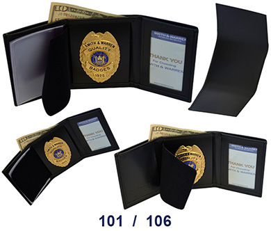 $72.50 101 - Tri-fold Badge Wallet Tri-fold wallet with wingle ID window & photo storage ID Size - 2 1/2" x 4" Badge Width - 3"