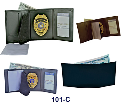 $76.50 101-C - Tri-fold Credit Card Badge Wallet Tri-fold wallets w/ single ID windows & 3 credit card slots ID Size - 2 1/4” x 4” Badge Width - 3”