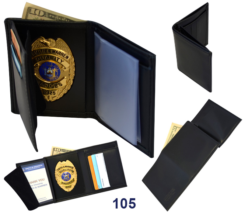 $79.00 105 - Tri-fold Credit Card Badge Wallet Recessed tri-rold badge wallet with credit card slots, single ID window ID Size - 2 1/2” x 4” Badge Width - 2 3/4”